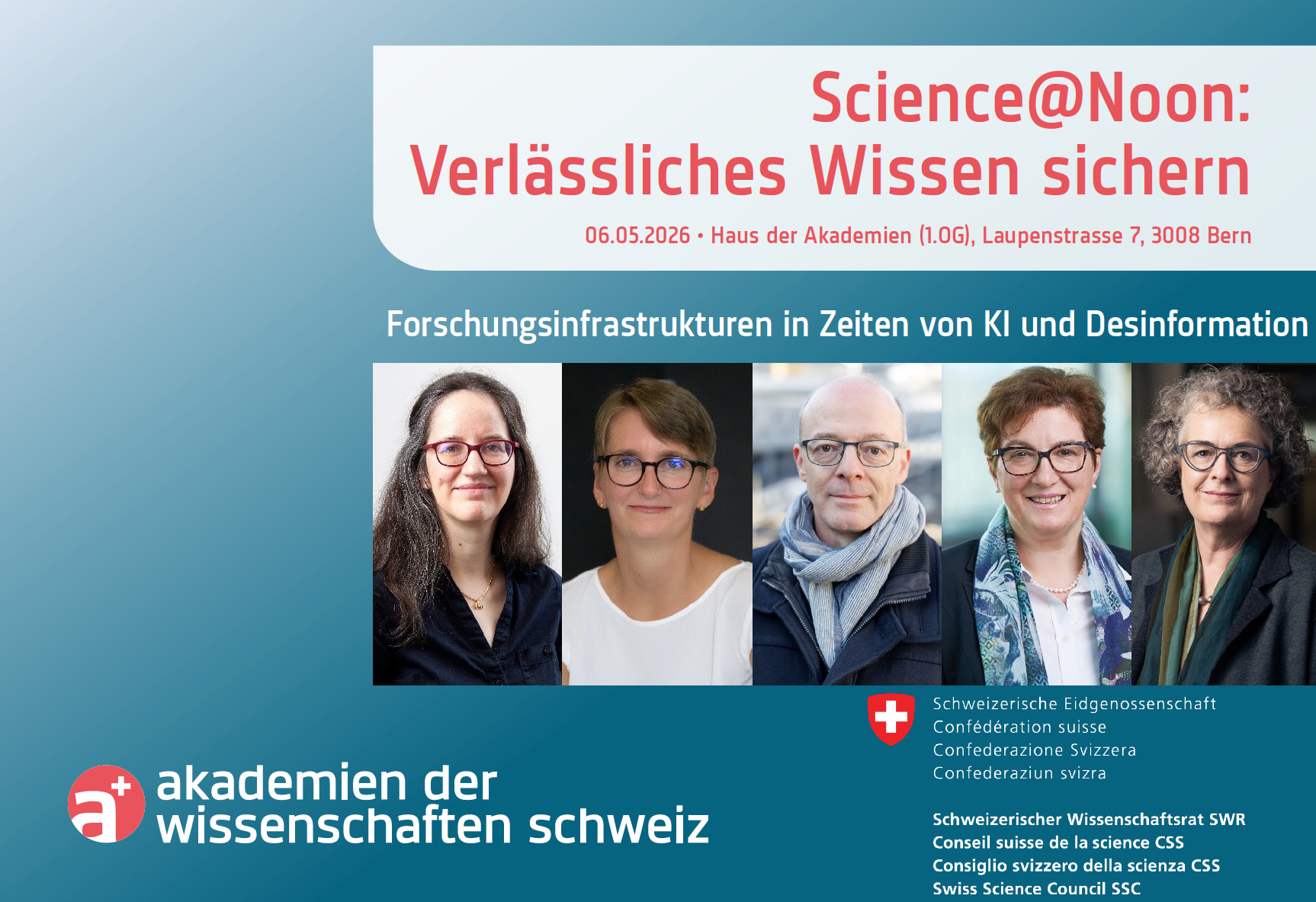 Wissen teilen, spannenden Menschen begegnen und Schnittstellen leben: Im Rahmen von «Science@Noon» diskutieren Akteure aus dem Netzwerk der Akademien der Wissenschaften regelmässig wissenschaftliche und wissenschaftspolitische Themen und geben sich gegenseitig Einblick in laufende und umgesetzte Projekte.